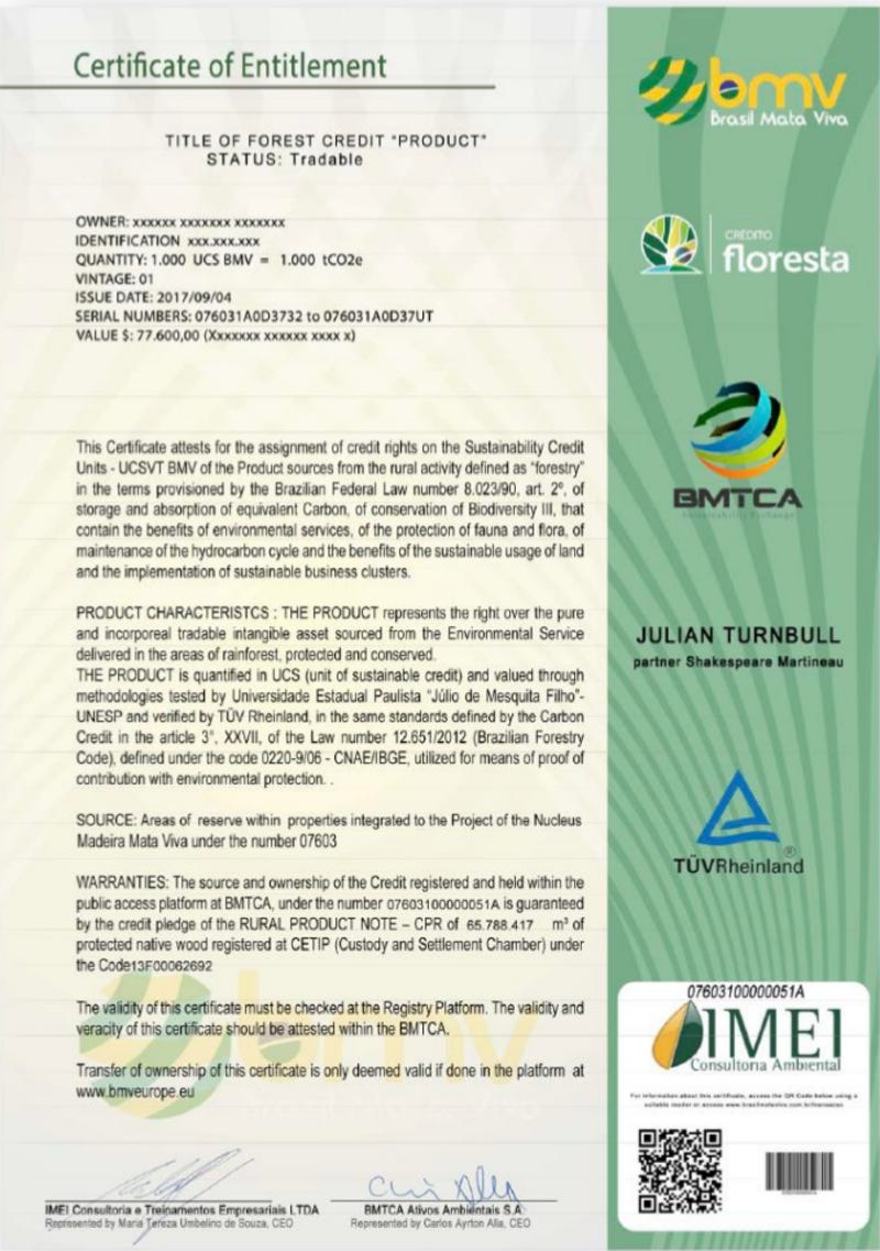 BMTCA Ativos Ambientas S/A is the intellectual property owner, manager and operator of an electronic exchange platform which provides a secure (blockchain based) system of issuing Forest Credits based on its proprietary methodology for calculating Sustainable Credit Units (“USC”).