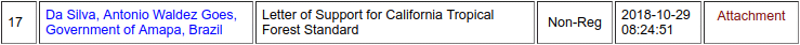 In September 2018, the California Air Resources Board released a draft California Tropical Forest Standard and a Draft Environmental Analysis. The California Air Resources Board invited comments on the Environmental Analysis by 5 pm on 29 October 2018.