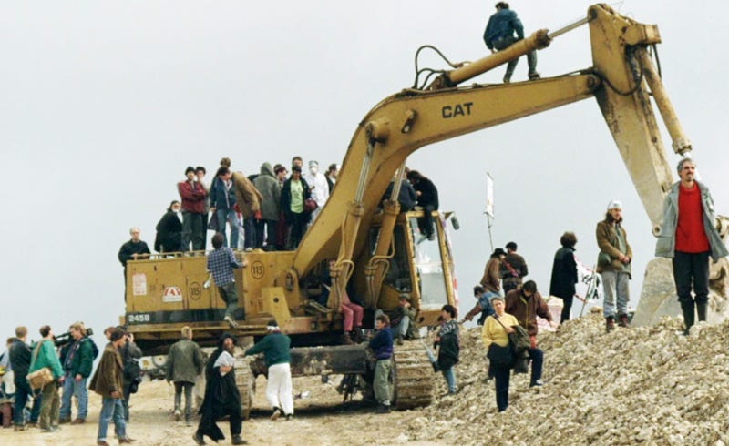 If you look very closely, you might just see me in this photo of one of the Twyford Down protests — unfortunately this time without the Arthur Dent lookalike: