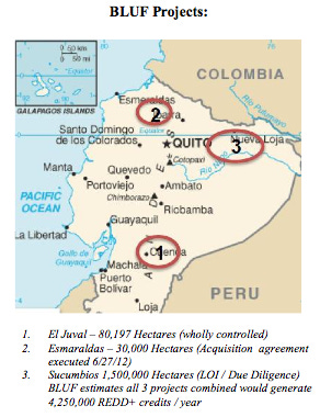 Drone describes BluForest as “Fundamentally Worthless”. As of 15 March 2013, the company had US$43 in cash and a grand total of US$$17,210 in current assets. Yet the company claims to have almost US$700 million in total assets. BluForest claims to have US$698,875,000 in “property for developing carbon assets.” This is based on the 135,000 hectares in Ecuador that BluForest controls (numbers 1 and 2 on the map below):