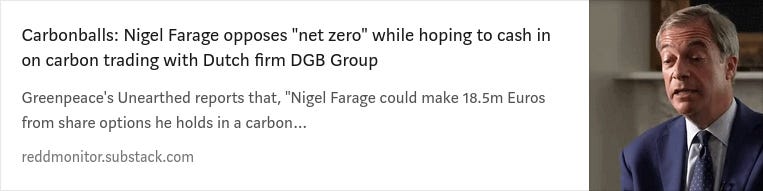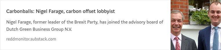 In 2021, Farage joined he advisory board of a company called Dutch Green Business Group N.V. The company buys and sells carbon offsets. Dutch Green Business Group made claims that it was planting trees at the projects it was buying carbon offsets from, when in fact it was just buying carbon offsets - in order to sell them at a profit.