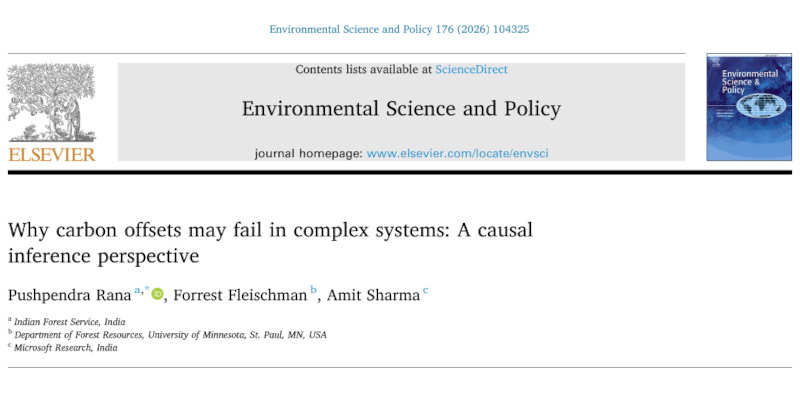 “Social-ecological system dynamics present a fundamental challenge to the attribution of changes in carbon stocks to actions taken by carbon offset sellers.” That’s the first line of the abstract of a recent paper published in Environmental Science and Policy. It’s written by Pushpendra Rana of the Indian Forest Service, Forrest Fleischman of the University of Minnesota, and Amit Sharma of Microsoft Research, India.