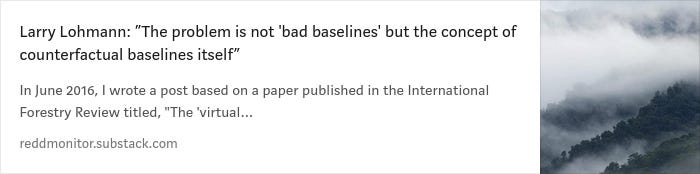 In 2016, Larry Lohmann discussed the problem of counterfactual baselines following on from a comment on REDD-Monitor: