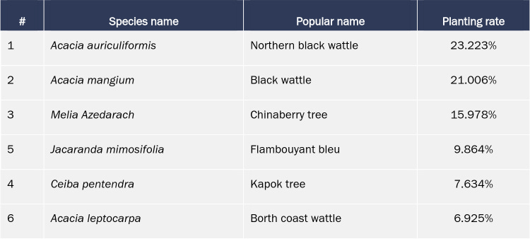 On its website, Carbon Credits Consulting states that the project involves planting “30 climate-resilient species, including native species”. However, project documents reveal that more than 84% of the trees to be planted consist of exotic species:
